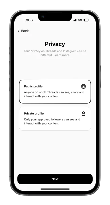Step 3: Choose whether you want to keep a public or private profile. After you choose one, tap Next.