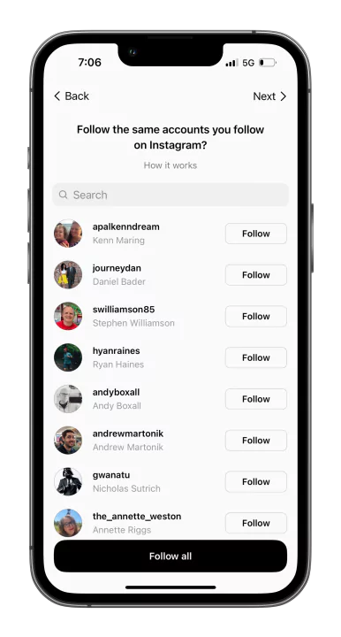 Step 4: A list of people whom you follow will be shown. You can tap the Follow All button to follow all on your Instagram Threads, tap the Follow button next to individual names to only follow selected people, or tap the Next button in the upper-right corner to skip this step.